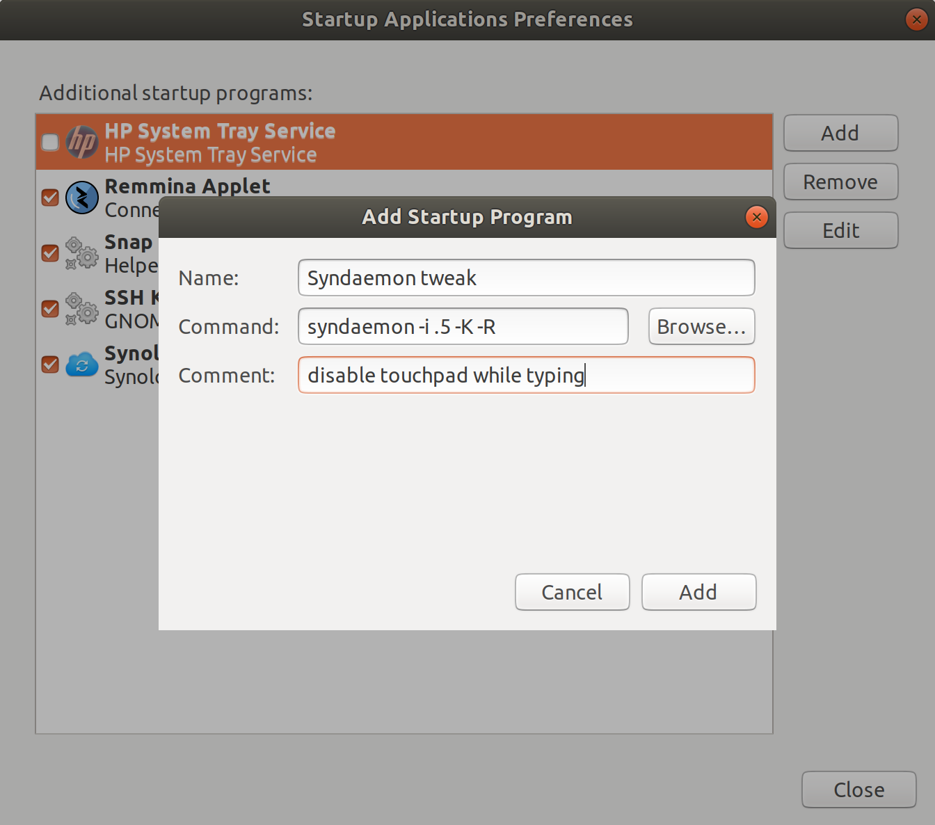 Lastly I had trouble typing as the touch pad was not disabled as I typed on the laptops keyboard. This was fixed by running syndaemon as a startup program, specifying half a second delay before enabling the touchpad again after typing.